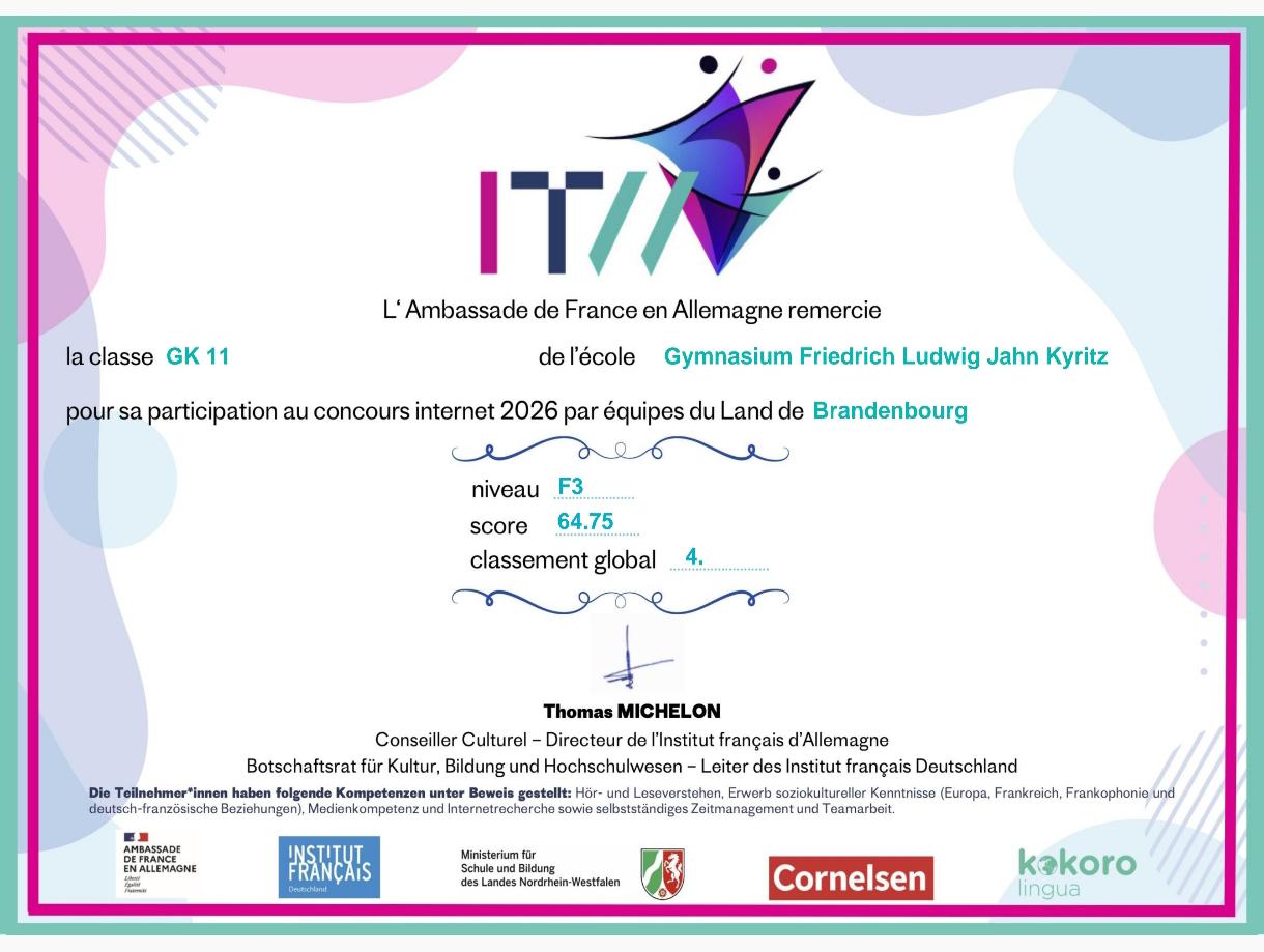 Im Rahmen des Deutsch-Französischen Tages nahmen die Klassen 8a, 10a sowie der Grundkurs 11 auf unterschiedlichen Niveaustufen am bundesweiten Teamwettbewerb des Institut français der Französischen Botschaft teil. Besonders erfolgreich war der Grundkurs 11: im fortgeschrittenen Sprachniveau erreichten die Schülerinnen und Schüler einen beachtlichen 4. Platz von insgesamt 17 teilnehmenden Schulen.